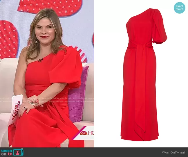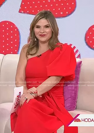 Jenna Bush Hager on Today on NBC was spotted wearing this red one puff shoulder dress on Today on Feb 14 2024's episode. Jenna's Dress is the Lucia Dress in High Risk Red by Cara Cara.