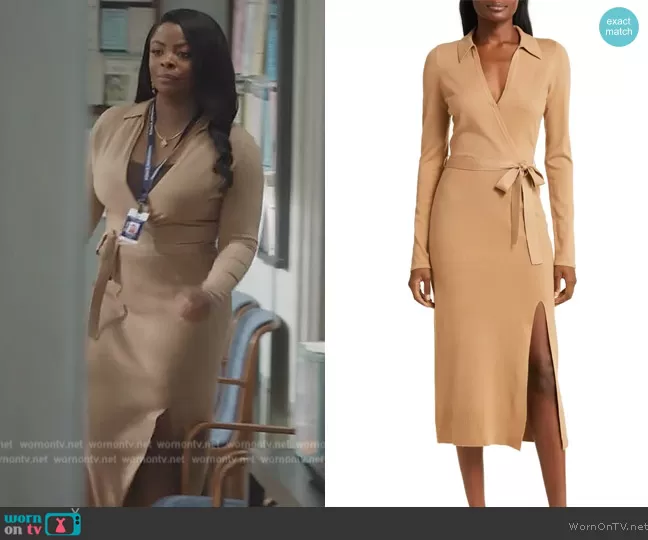 Ava Coleman (played by Janelle James) on Abbott Elementary on ABC was spotted wearing this beige wrap dress on Abbott Elementary on episode 'Gregory's Garden Goofballs' (3x03) in Feb 2024. Ava's Dress is the Carmen Belted Long Sleeve Sweater Dress by Paige.