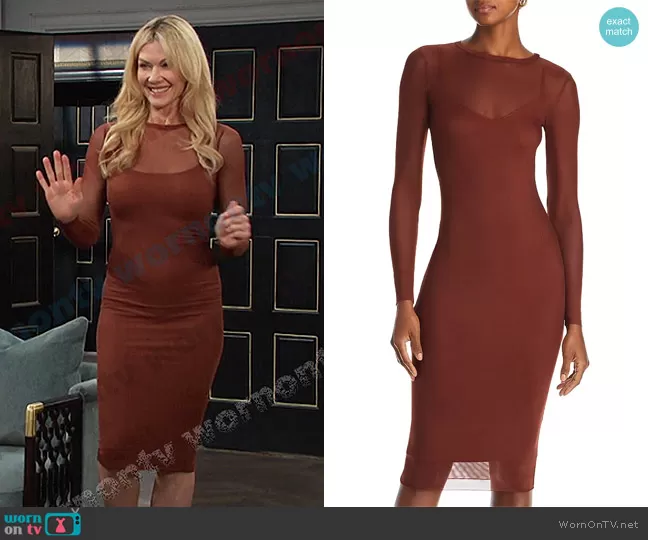Kristen DiMera (played by Stacy Haiduk) on Days of our Lives on Peacock was spotted wearing this brown mesh dress on Days of our Lives on Feb 16 2024's episode. Kristen's Dress is the Mesh Bodycon Midi Dress by Aqua.