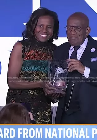 on Today on NBC was spotted wearing this multicolor lace overlay dress on Today on Feb 16 2024's episode. 's Dress is the Sleeveless Shift Dress with Embellished Lace Overlay by Bottega Veneta.