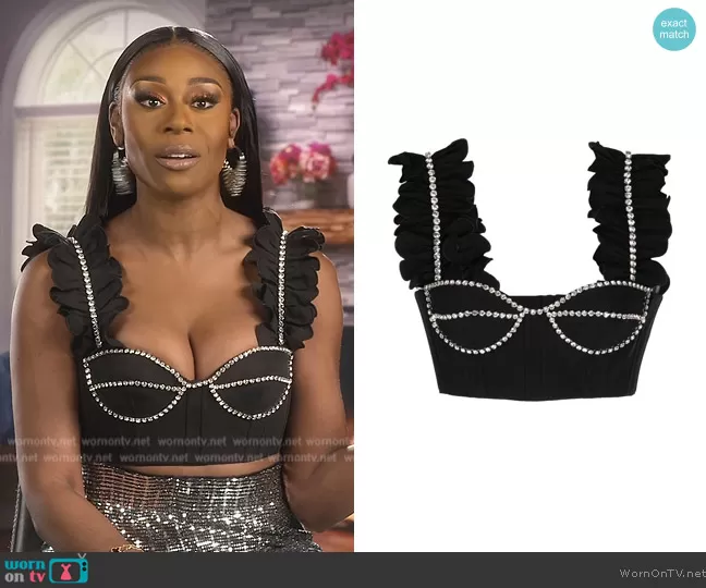 Nneka Ihim on The Real Housewives of Potomac on Bravo was spotted wearing this black confessional ruffle trim top on The Real Housewives of Potomac on episode 'Sharing Is Caring' (8x13) in Feb 2024. Nneka's Top is the Crystal-embellished cropped top by Area.