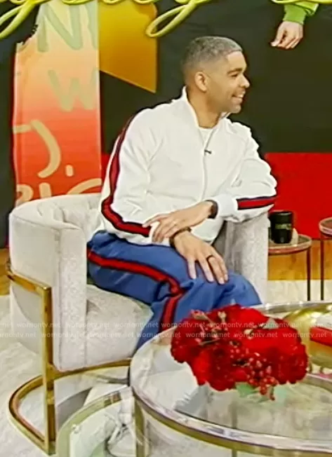 on Tamron Hall Show on ABC was spotted wearing this white stripe jacket and pants on Tamron Hall Show on Feb 15 2024's episode. 's Jacket is the Fluid Drill Zip Jacket by Gucci . 's Pants is the Fluid Drill Trousers by Gucci.