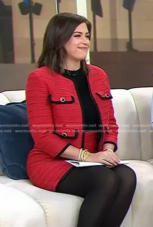 Chloe Melas on Today on NBC was spotted wearing this red tweed jacket and mini skirt on Today on Feb 19 2024's episode. Chloe's Jacket is the Open Front Bouclé Jacket by Ted Baker . Chloe's Skirt is the Mixed Media Dress by Ted Baker.