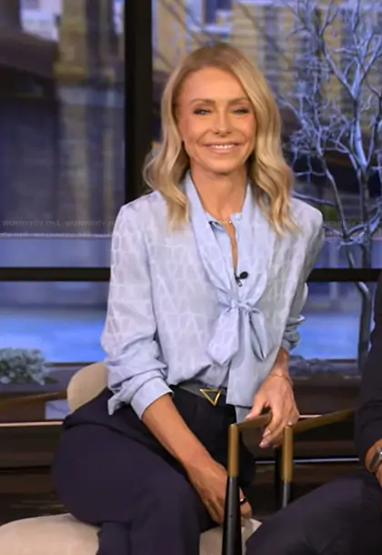 Kelly Ripa on Live with Kelly and Mark on Disney ABC Home Entertainment was spotted wearing this blue tie neck blouse on Live with Kelly and Mark on Jan 16 2026's episode. Kelly's Top is the Toile Iconographe Silk Jacquard Blouse by Valentino Garavani.