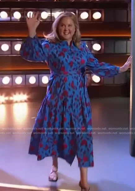 on The Kelly Clarkson Show on NBC was spotted wearing this blue floral print shirtdress on The Kelly Clarkson Show on Feb 20 2024's episode. 's Dress is the Lux Leaf Print Long Sleeve Midi Shirtdress by Diane von Furstenberg.