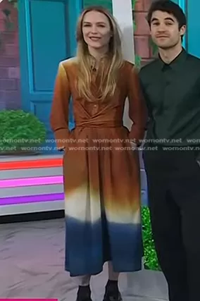 on Today on NBC was spotted wearing this orange and blue tie dye shirtdress on Today on Feb 20 2024's episode. 's Dress is the Abstract Ombré Stretch Cotton Poplin Shirtdress by Oscar de la Renta.
