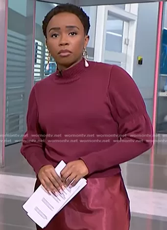 Zinhle Essamuah on NBC News Daily on NBC was spotted wearing this burgundy sweater on NBC News Daily on Feb 20 2024's episode. Zinhle's Sweater is the Puff Sleeve Sweater in Maroon by Derek Lam Collective.