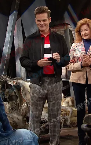 Leo Stark (played by Greg Rikaart) on Days of our Lives on Peacock was spotted wearing this grey plaid pants on Days of our Lives on Feb 21 2024's episode. Leo's Pants is the Perin Plaid Stretch Wool Trousers by Boss.