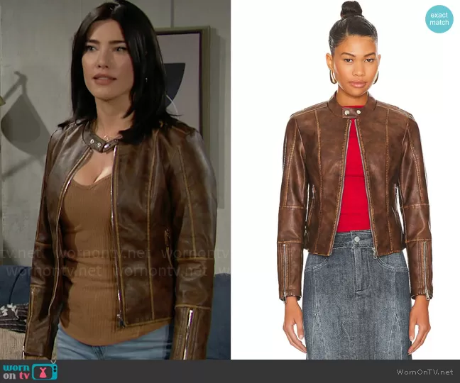 Steffy Forrester (played by Jacqueline MacInnes Wood) on The Bold and the Beautiful on CBS was spotted wearing this brown leather jacket on The Bold and the Beautiful on Feb 21 2024's episode. Steffy's Jacket is the Steph Faux Leather Moto Jacket by Superdown .