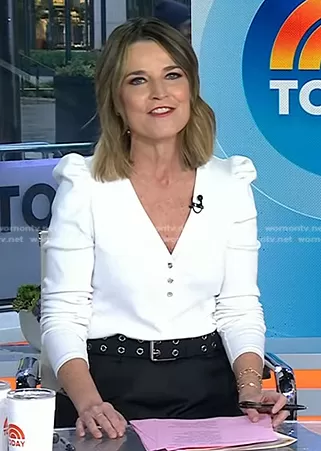 Savannah Guthrie on Today on NBC was spotted wearing this white long puff sleeve top on Today on Mar 07 2024's episode. Savannah's Top is the Dekalb Top in White by Veronica Beard.