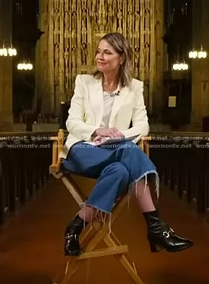 Savannah Guthrie on Today on NBC was spotted wearing this yellow blazer and cropped jeans on Today on Feb 21 2024's episode. Savannah's Jacket is the Danielle Dickey Blazer in Yellow by Veronica Beard . Savannah's Pants is the Grant Wide-Leg Patch Pocket Jeans by Veronica Beard . Savannah's Shoes is the Horsebit-Detailed Leather Ankle Boots by Gucci.