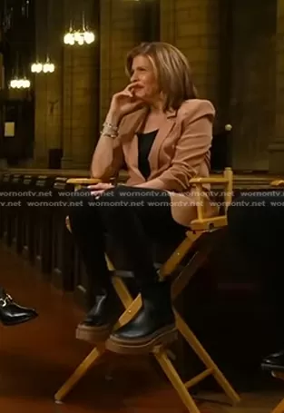 Hoda Kotb on Today on NBC was spotted wearing this brown blazer and chunky boots on Today on Feb 21 2024's episode. Hoda's Jacket is the Crepe Khloe Blazer by Cinq a Sept . Hoda's Shoes is the Rain-Storm Platform Chelsea Boot in Black Honey by Jeffrey Campbell . Hoda's Earrings is the Gold Plated Elle Drop Earrings in Brown Tigers Eye by Kendra Scott.