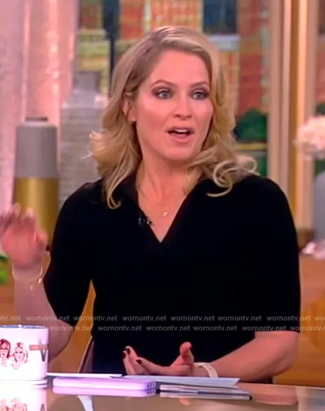 Sara Haines on The View on ABC was spotted wearing this black ribbed polo dress on The View on Feb 21 2024's episode. Sara's Dress is the Pati Polo Midi-Dress by Simkhai.