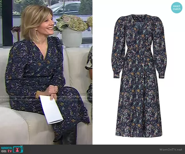 on Today on NBC was spotted wearing this navy printed midi dress on Today on Feb 21 2024's episode. 's Dress is the Floral Dress in Blue by Derek Lam Collective.