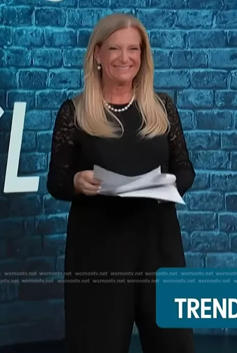 on Access Hollywood on NBC was spotted wearing this black lace sleeve jumpsuit on Access Hollywood on Feb 21 2024's episode. 's Jumpsuit is the Lace Sleeve Jumpsuit by Tommy HIlfiger.