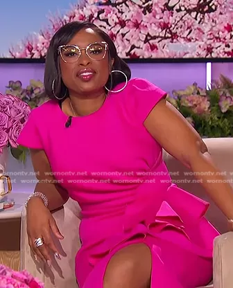 Jennifer Hudson on The Jennifer Hudson Show on FOX was spotted wearing this pink ruffle dress on The Jennifer Hudson Show on Feb 21 2024's episode. Jennifer's Dress is the Cap Sleeve Sheath Tea Length Evening Dress - 23856 in Fuchsia by Jovani . Jennifer's Glasses is the Irregular Eyeglasses 52ZV55-O by Prada.