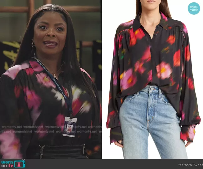 Ava Coleman (played by Janelle James) on Abbott Elementary on ABC was spotted wearing this black blurred floral print blouse on Abbott Elementary on episode 'Smoking' (3x04) in Feb 2024. Ava's Top is the Aubrey Floral Print Button-Up Top by Rag & Bone.