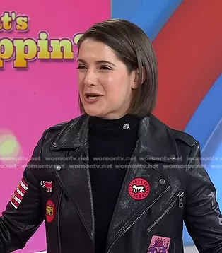 on Today on NBC was spotted wearing this multi patch leather moto jacket on Today on Feb 22 2024's episode. 's Jacket is the Cody Keith Haring-design Cropped Leather Jacket in Black by Alice + Olivia.