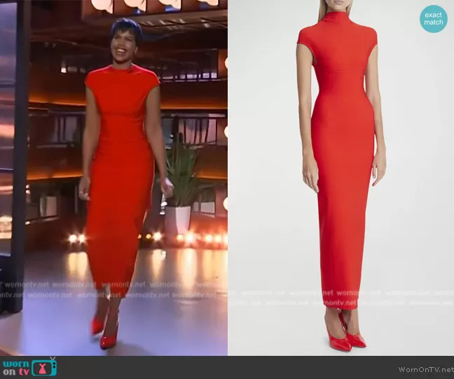 on The Kelly Clarkson Show on NBC was spotted wearing this red cap sleeve dress on The Kelly Clarkson Show on Feb 23 2024's episode. 's Dress is the Sculpting Jersey Corset Midi Dress by Alaia.