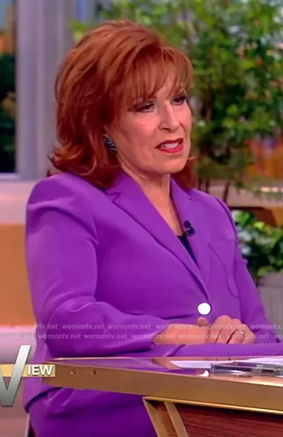 Joy Behar on The View on ABC was spotted wearing this purple blazer and pants on The View on Jul 17 2024's episode. Joy's Blazer is the Patch Pocket Shrunken Crepe Jacket by Theory . Joy's Pants is the Treeca Admiral Slim Ankle Pants by Theory.