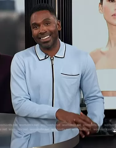 Justin Sylvester on E! News on E! was spotted wearing this blue piping shirt on E! News on Feb 23 2024's episode. Justin's Shirt is the Saji Striped Cotton-Blend Zip-Up Cardigan by Saturdays NYC.
