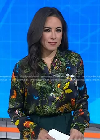 Kaylee Hartung on Today on NBC was spotted wearing this black butterfly print blouse on Today on Feb 23 2024's episode. Kaylee's Top is the Tyler Jungle Silk Blouse in Black Multi Butterfly Tiger by L'Agence.
