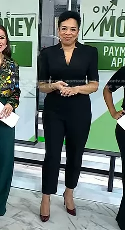 on Today on NBC was spotted wearing this black v-neck short sleeve jumpsuit on Today on Feb 23 2024's episode. 's Jumpsuit is the Structured Crepe Forever Belted Jumpsuit by Karen Millen.