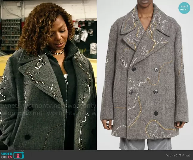 Robyn McCall (played by Queen Latifah) on The Equalizer on CBS was spotted wearing this grey studded chain coat on The Equalizer on episode 'Full Throttle' (4x02) in Feb 2024. Robyn's Coat is the Raven Embellished Peacoat by Dries van Noten.