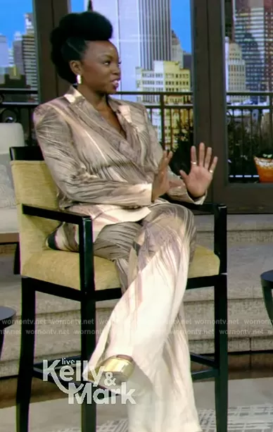 on Live with Kelly and Mark on Disney ABC Home Entertainment was spotted wearing this printed suit on Live with Kelly and Mark on Feb 22 2024's episode. 's Blazer is the Printed Blazer by Roberto Cavalli . 's Pants is the Printed cotton drill flared pants by Roberto Cavalli.