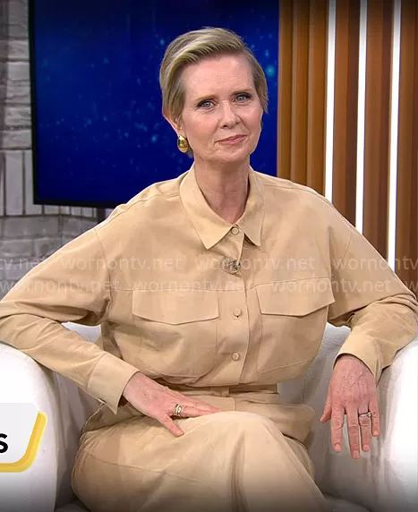 on CBS Mornings on CBS was spotted wearing this beige suede shirt and pants set on CBS Mornings on Feb 26 2024's episode. 's Top is the Paperfine Suede Shirt Jacket by Lafayette 148 New York . 's Pants is the Paperfine Suede Thames Wide Leg Pant by Lafayette 148 New York.