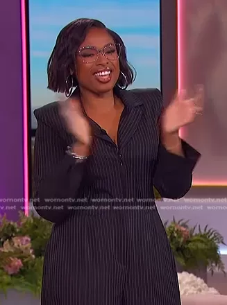 Jennifer Hudson on The Jennifer Hudson Show on FOX was spotted wearing this black pinstripe jumpsuit on The Jennifer Hudson Show on Feb 27 2024's episode. Jennifer's Jumpsuit is the Tailored Oversized Tux Jumpsuit in black pinstripe by Asos.