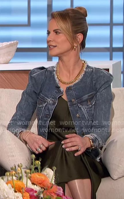 Natalie Morales on The Talk on CBS was spotted wearing this puff sleeve denim jacket on The Talk on Feb 27 2024's episode. Natalie's Jacket is the Chelsea Jacket by Retrofete.