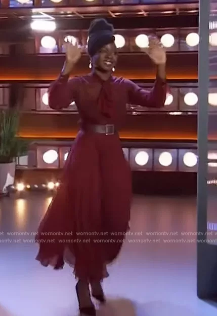 on The Kelly Clarkson Show on NBC was spotted wearing this burgundy sheer tie neck dress on The Kelly Clarkson Show on Feb 27 2024's episode. 's Dress is the Scarf-Neck Pleated Asymmetric Midi Dress by Sergio Hudson.