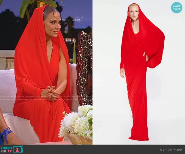 Dorit Kemsley on The Real Housewives of Beverly Hills on Bravo was spotted wearing this red reunion dress on The Real Housewives of Beverly Hills on episode 'Reunion' (13x18) in Feb 2024. Dorit's Dress is the Hooded Dress by Schiaparelli . Dorit's Shoes is the Cam-Patent Leather Platform Sandals by Balmain.