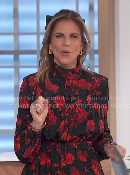 Natalie Morales on The Talk on CBS was spotted wearing this rose print dress on The Talk on Feb 28 2024's episode. Natalie's Dress is the Short Printed Silk Shirt Dress by The Kooples.
