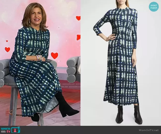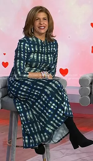 Hoda Kotb on Today on NBC was spotted wearing this blue tie dye dress on Today on Feb 28 2024's episode. Hoda's Dress is the Natalee Tie-Dye Ruched A-Line Midi Dress by Proenza Schouler White Label.