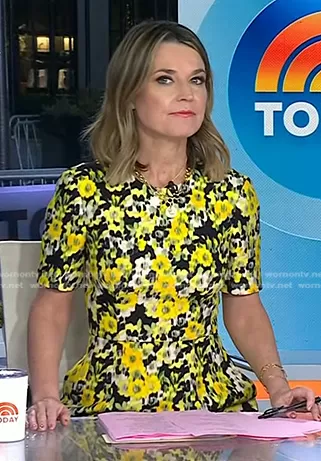 Savannah Guthrie on Today on NBC was spotted wearing this yellow floral dress on Today on Feb 28 2024's episode. Savannah's Dress is the Evangeline Floral Print Wool Midi Dress by Adam Lippes . Savannah's Shoes is the Block Heel Loafer Pump by Prada.