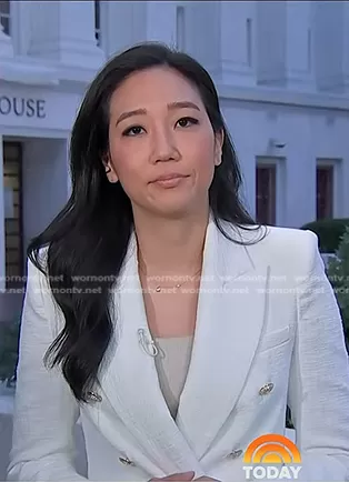 on Today on NBC was spotted wearing this white double breasted blazer on Today on Feb 28 2024's episode. 's Jacket is the Textured Double Breasted Blazer by Zara.