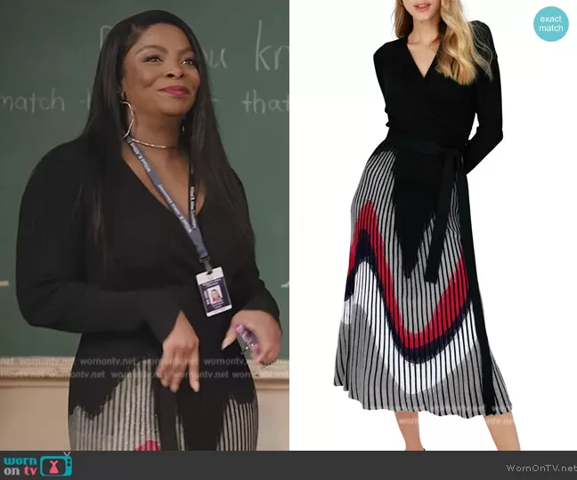 Ava Coleman (played by Janelle James) on Abbott Elementary on ABC was spotted wearing this black contrast ribbed sweater dress on Abbott Elementary on episode 'Breakup' (3x05) in Feb 2024. Ava's Dress is the Reiko Long Sleeve Midi Sweater Dress by Diane von Furstenberg.