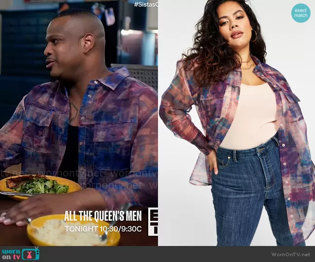 Maurice Webb (played by Brian Jordan Jr.) on Tyler Perrys Sistas on BET was spotted wearing this sheer tie dye button down shirt on Tyler Perrys Sistas on episode 'Threes a Crowd' (7x09) in Feb 2024. Maurice's Shirt is the Trendy Plus Size Organza Oversized Shirt by Nina Parker.