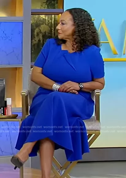 on Tamron Hall Show on ABC was spotted wearing this blue dress on Tamron Hall Show on Feb 29 2024's episode. 's Dress is the Draped Wool-crepe Midi Dress In Cobalt Blue by Roland Mouret.