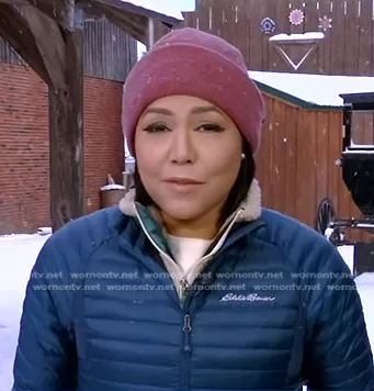Stephanie Ramos on Good Morning America on ABC was spotted wearing this teal quilted down jacket on Good Morning America on Feb 29 2024's episode. Stephanie's Jacket is the MicroTherm 2.0 Down Jacket by Eddie Bauer.