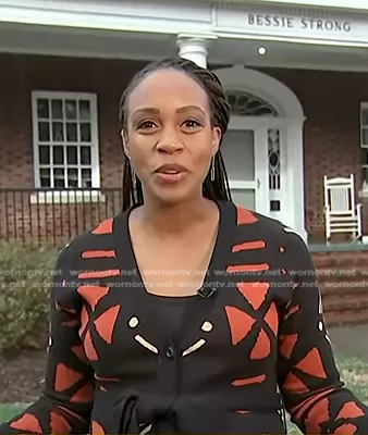 on Today on NBC was spotted wearing this black and orange print cardigan on Today on Feb 29 2024's episode. 's Sweater is the Aisha African Print Cardigan in Natural Mudcloth by D’Iyanu.