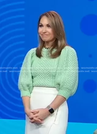 Lori Bergamotto on Good Morning America on ABC was spotted wearing this green cable knit puff sleeve sweater on Good Morning America on Mar 01 2024's episode. Lori's Sweater is the Ebba Cable Sweater in Mint by Sea.