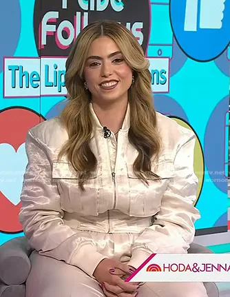 on Today on NBC was spotted wearing this white satin bomber jacket and cargo pants on Today on Mar 01 2024's episode. 's Jacket is the Miranda Bomber Jacket in Cream by Lovers and Friends . 's Pants is the Miranda Cargo Pant in Cream by Lovers and Friends.