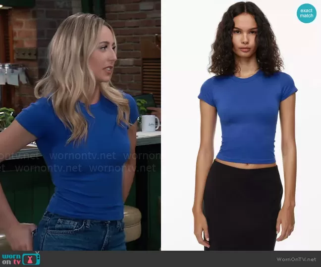 Seamless at Aritzia Sinch Smooth Willow T-Shirt in Boxcar Blue worn by Josslyn Jacks (Eden McCoy) on General Hospital