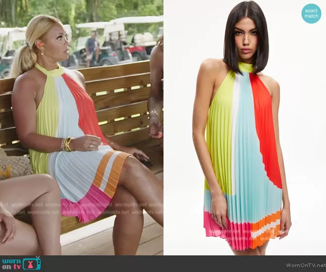 Gizelle Bryant on The Real Housewives of Potomac on Bravo was spotted wearing this colorblock pleated dress on The Real Housewives of Potomac on episode 'Fool's Gold' (8x15) in Mar 2024. Gizelle's Dress is the Aviana Halterneck Sunburst Pleated Mini Dress by Alice + Olivia.
