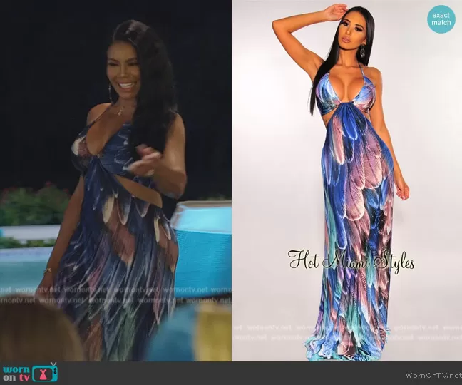 Mia Thornton on The Real Housewives of Potomac on Bravo was spotted wearing this blue feather print cutout dress on The Real Housewives of Potomac on episode 'Fool's Gold' (8x15) in Mar 2024. Mia's Dress is the Amethyst Feather Print Cutout Dress by Hot Miami Styles.