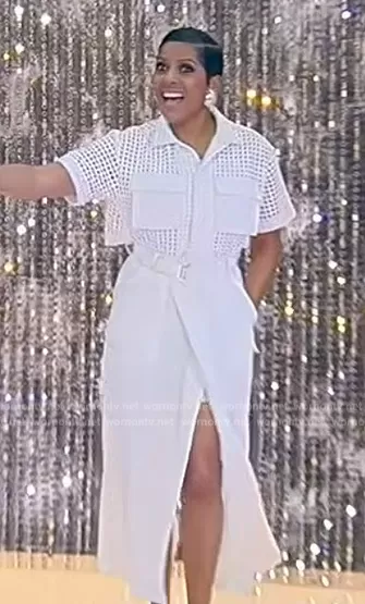 Tamron Hall on Tamron Hall Show on ABC was spotted wearing this white grid cutouts shirtdress on Tamron Hall Show on Mar 04 2024's episode. Tamron's Dress is the Lace-trimmed cotton midi dress by Sacai . Tamron's Shoes is the Leather Sandals by Giuseppe Zanotti.