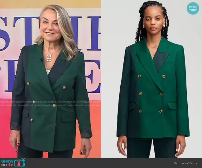 on Today on NBC was spotted wearing this green colorblock blazer on Today on Aug 19 2024's episode. 's Jacket is the Colorblocked Peak Lapel Blazer in Emerald/Forest by Argent.